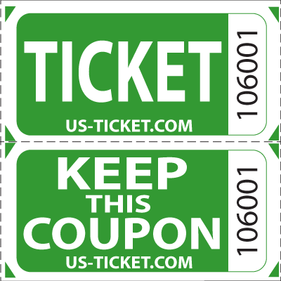 Double Roll Tickets in 14 standard colors ! Your raffle or event will stand out from the crowd with these super bright tickets printed on white ticket stock. These stock 2-part tickets have "TICKET" on the top half and "KEEP THIS COUPON" on the bottom half. Use as a raffle ticket for any raffle event with a drawing. Each Double Ticket is two inches by two inches, and scored in the center for easy separation. Each half is one inch by two inches with the same number on both parts for easy prize redemption. The backside of the top half of each ticket includes a space for Name, E-mail and a Phone number for raffles that do not require the winner to be present. 1000 sequentially numbered Double Tickets Per Roll. If the 14 stock colors are not enough, just let us know - we can make these in any color combination you want ! We can quickly customize these for any event or raffle or any other purpose. Perhaps you need custom numbering or special security features - we can do that too ! We can even make these in different dimensions. Call 800-368-8311 and talk to a real person.